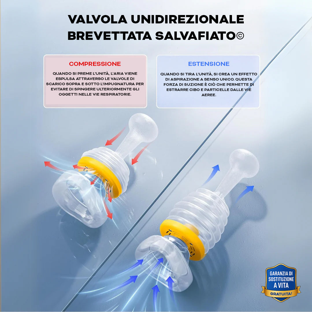Questo meccanismo assicura che l'oggetto bloccato venga aspirato verso l’esterno senza alcun rischio di essere spinto ancora più in profondità. SalvaFiato è stato progettato per offrire una soluzione sicura ed efficace nelle emergenze da soffocamento.