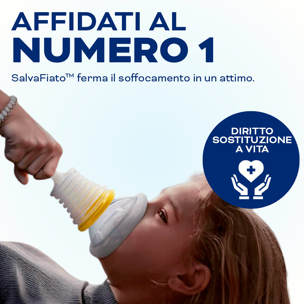 SalvaFiato è progettato per essere utilizzato dopo che le procedure di soccorso per soffocamento sono state tentate senza successo. Raccomandiamo la manovra di Heimlich come primo intervento standard in caso di soffocamento e di chiamare i soccorsi.